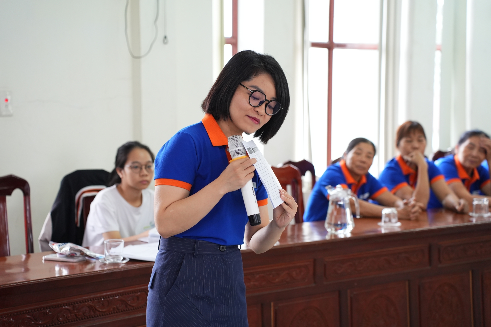(Hình ảnh: Đại diện Ban Tổ chức chia sẻ về hướng dẫn sử dụng thùng ủ và nắp hố ủ rác hữu cơ đến người tham gia)