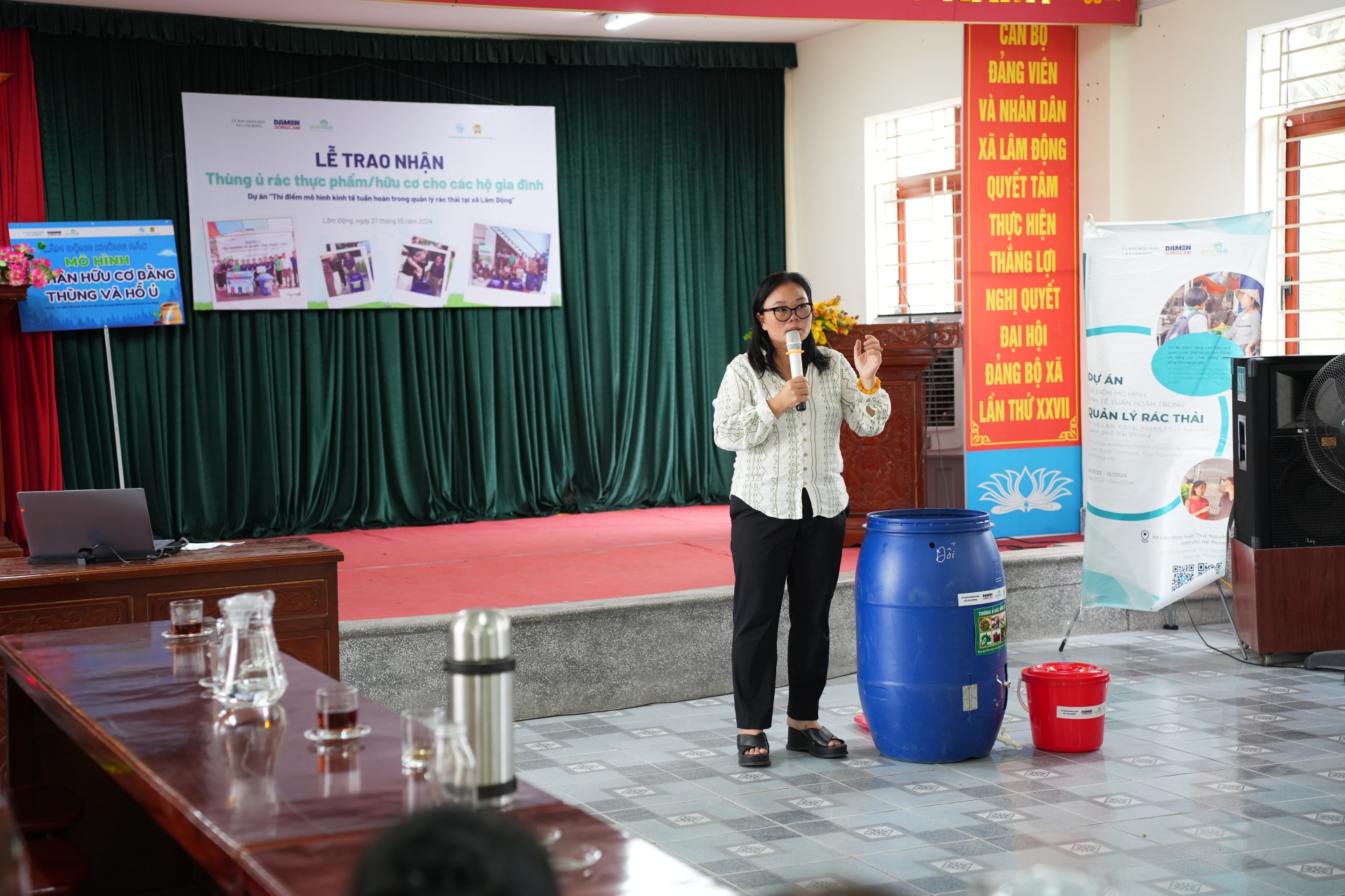Ngày 27/10 vừa qua, GreenHub đã phối hợp cùng UBND xã Lâm Động dưới sự tài trợ và đồng thực hiện của Công ty TNHH Đóng tàu Damen Sông Cấm trao tặng 50 thùng ủ và nắp hố ủ rác hữu cơ đến các hộ gia đình trong xã sau 2 tháng triển khai thí điểm tại Thôn Hầu. Đây là bước tiến mới trong dự án Lâm Động Không rác, giúp người dân chuyển đổi rác thải thực phẩm thành phân bón hữu cơ, giảm áp lực cho hệ thống xử lý rác và hỗ trợ phát triển nông nghiệp bền vững.
