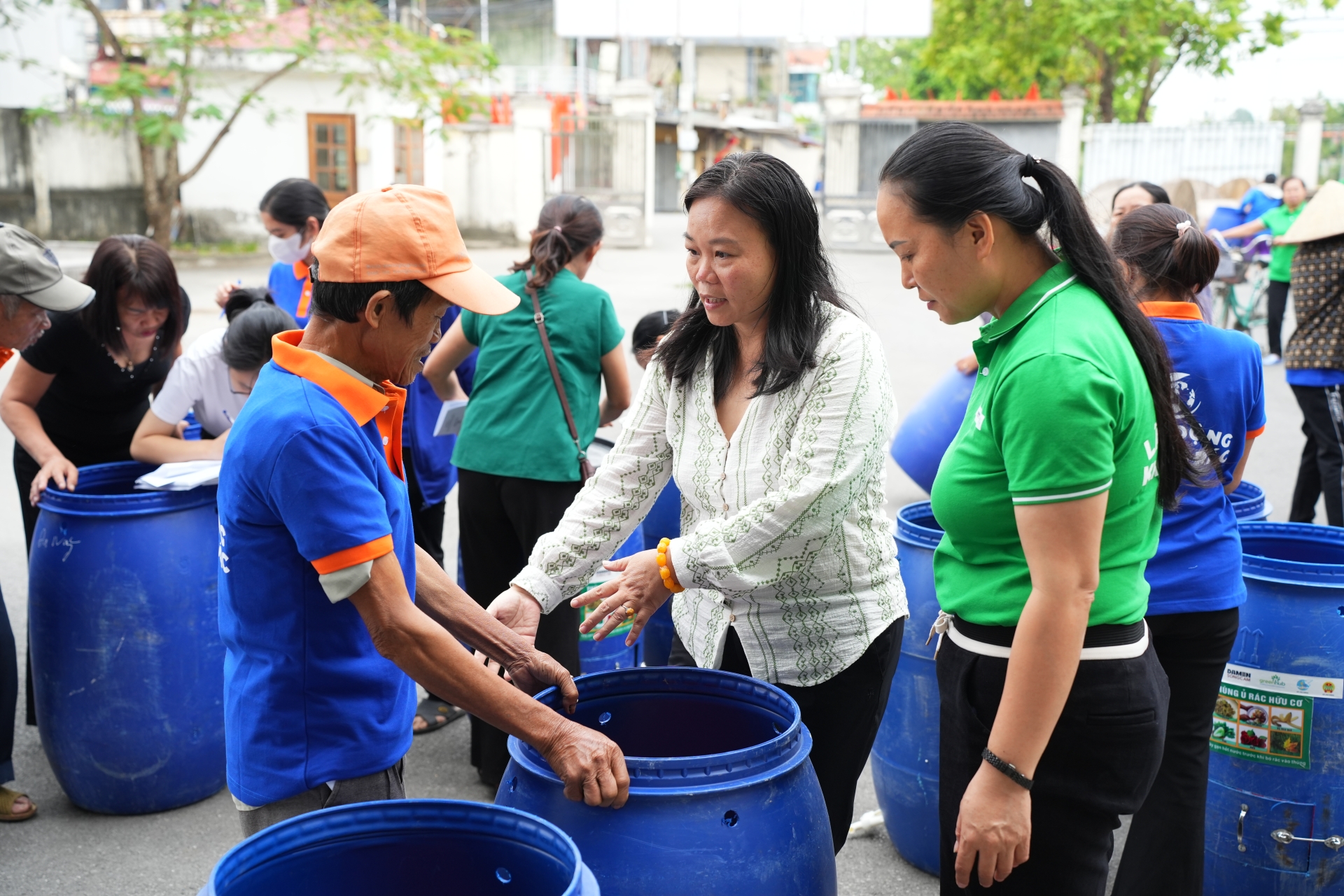 (Hình ảnh: Các hộ gia đình nhận thùng hủ và nắm hố ủ rác hữu cơ)