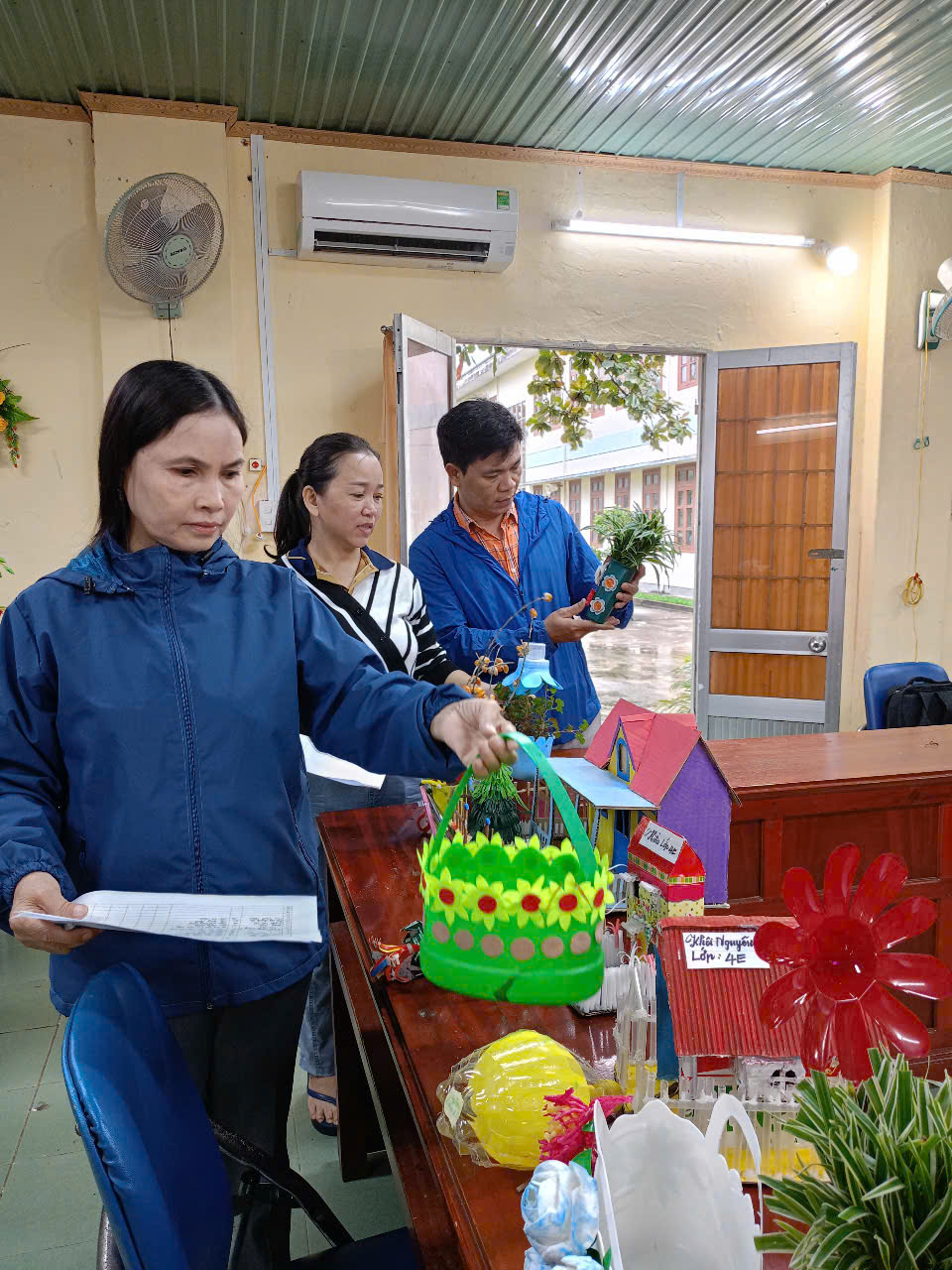 Hình ảnh: Cô Lành đang chấm thi các sản phẩm trong cuộc thi Tái chế do trường tổ chức.