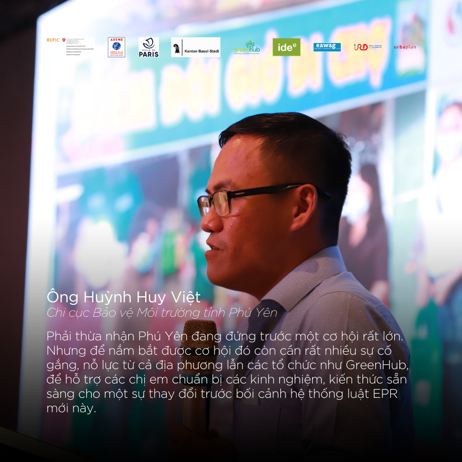 Hội thảo còn có sự tham gia của đại diện Chi cục Tài nguyên và Môi trường tỉnh Phú Yên và Hội Liên hiệp Phụ nữ (LHPN) tỉnh Phú Yên. Ông Huỳnh Huy Việt - Trưởng phòng Hành chính chi cục Bảo vệ Môi trường phát biểu: “Phải thừa nhận Phú Yên đang đứng trước một cơ hội rất lớn. Nhưng để nắm bắt được cơ hội đó còn cần rất nhiều sự cố gắng, nỗ lực từ cả địa phương lẫn các tổ chức như GreenHub, để hỗ trợ các chị em chuẩn bị các kinh nghiệm, kiến thức sẵn sàng cho một sự thay đổi lớn trước hệ thống luật EPR mới này”.