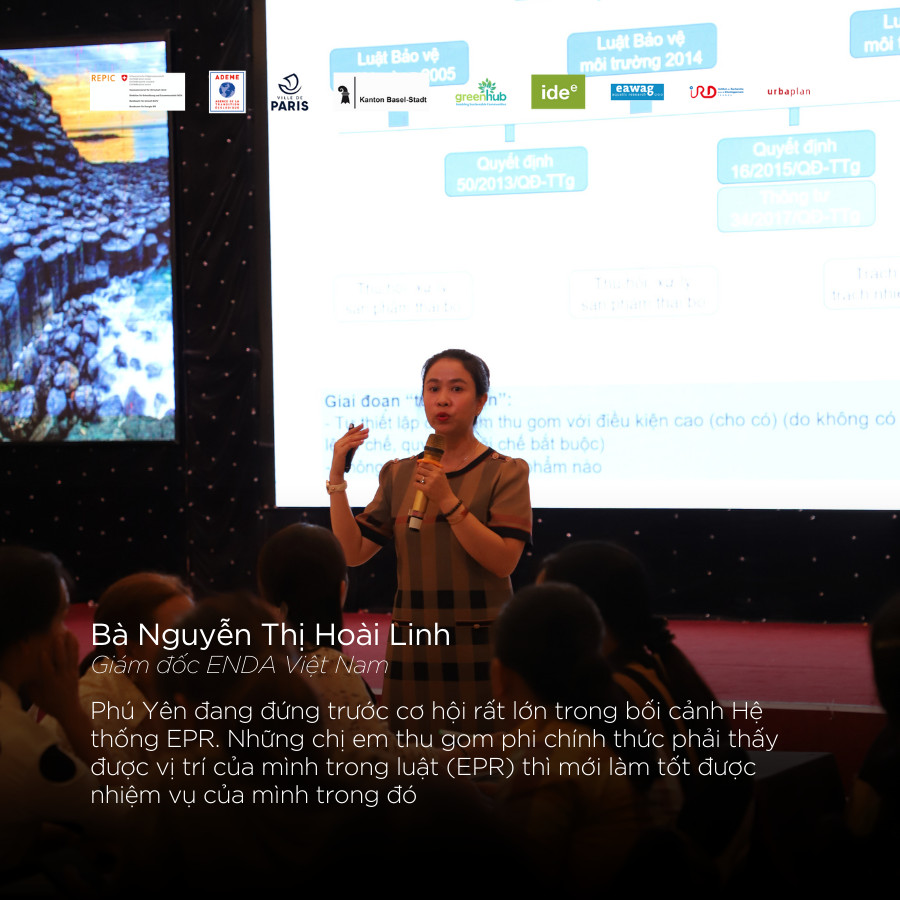 Phát biểu tại Hội thảo Giám đốc Tổ chức ENDA Việt Nam Bà Nguyễn Thị Hoài Linh chia sẻ: “Phú Yên đang đứng trước cơ hội rất lớn trong bối cảnh Hệ thống EPR. Những chị em thu gom phi chính thức phải thấy được vị trí của mình trong luật (EPR) thì mới làm tốt được nhiệm vụ của mình trong đó, chúng ta tham gia không chỉ để kiếm thêm tiền, mà còn để lời nói của người thu gom có trọng lượng, có sức ảnh hưởng hơn trong hệ thống quản lý chất thải rắn tại Phú Yên”.