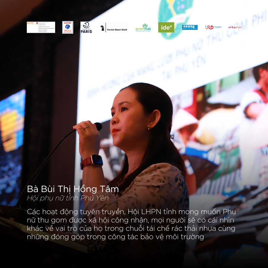 Ngoài ra còn có Hội Phụ nữ tỉnh Phú Yên chia sẻ: “Các hoạt động tuyên truyền, Hội LHPN tỉnh mong muốn Phụ nữ thu gom được xã hội công nhận, mọi người sẽ có cái nhìn khác về vai trò của họ trong chuỗi tái chế rác thải nhựa cùng những đóng góp trong công tác bảo vệ môi trường”.
