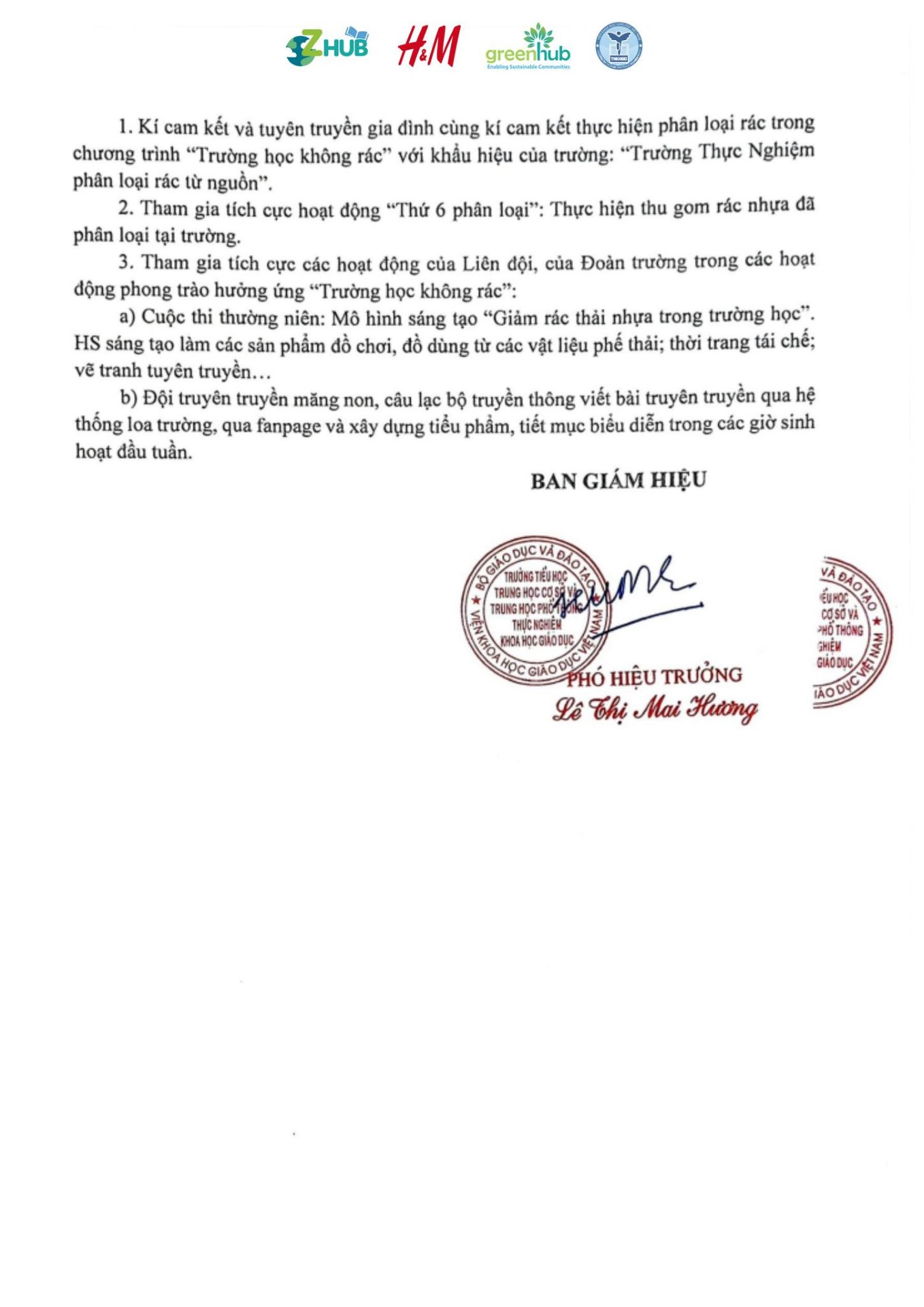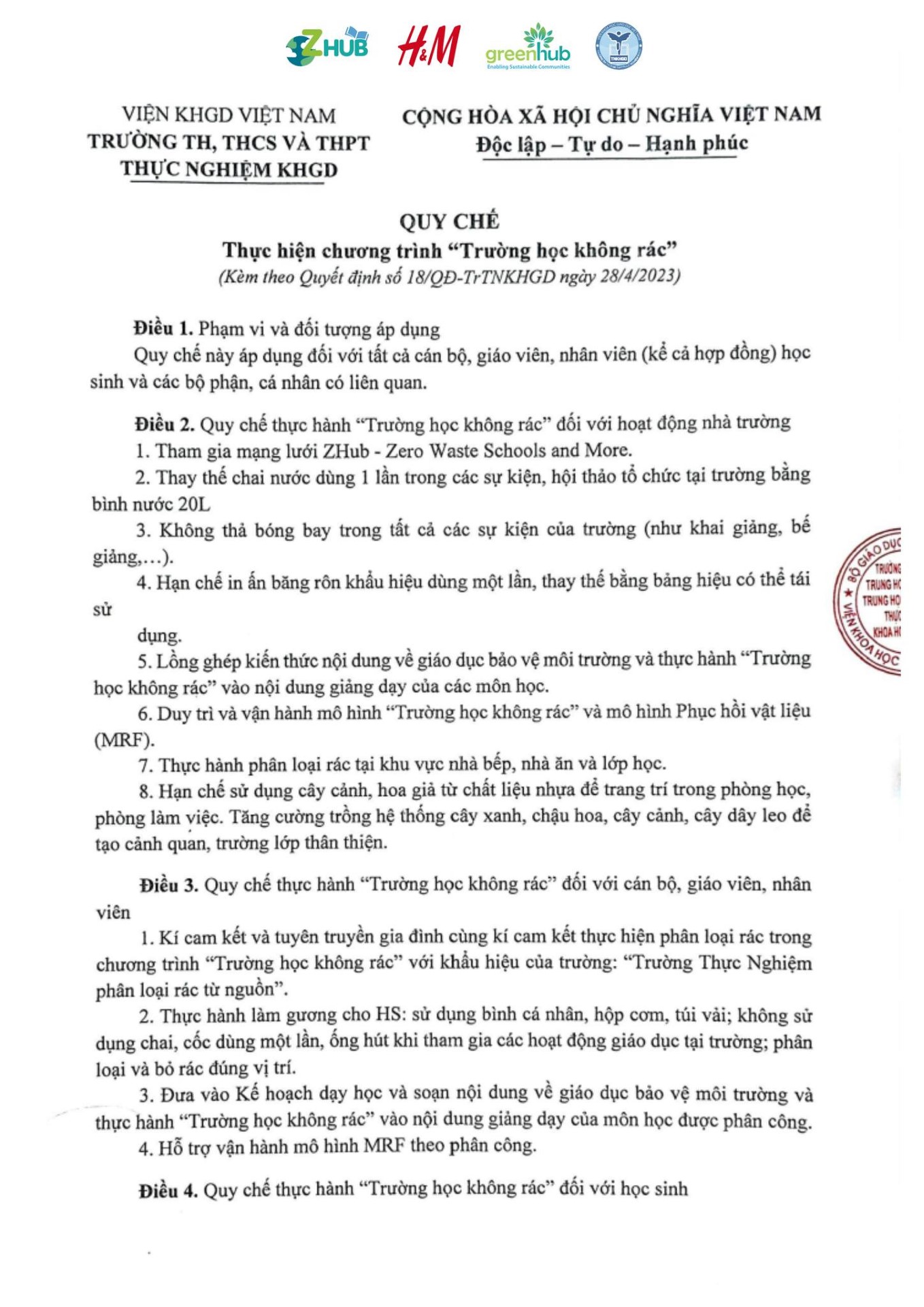 Là ngôi trường tiên phong trong việc Ban hành Quy chế Trường học không rác tại địa bàn Hà Nội, hiện nay trường TH, THCS và THPT Thực Nghiệm KHGD và GreenHub đã có những hành động thiết thực, hỗ trợ thúc đẩy trực tiếp mô hình tại trường.